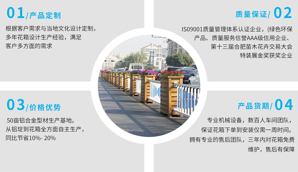 •       上海曦信環??萍脊煞萦邢薰境闪⒂?013年,是一家專業的馬路花箱供應商。本公司自成立以來,經歷了奠定基礎,穩步發展的過程。品牌已形成市場優勢,現正處于乘勢而上發展壯大的階段。創立先進的經營理念和企業文化,生產經營規模不斷發展壯大。公司主要從事馬路花箱,花箱護欄,木紋鋁合金花箱,座椅花箱,鋁板花箱、不銹鋼花箱、鋁合金護欄、鋁合金葡萄架,公園座椅,戶外果皮箱垃圾桶、鋁合金葡萄架等金屬建材產品的生產和銷售...